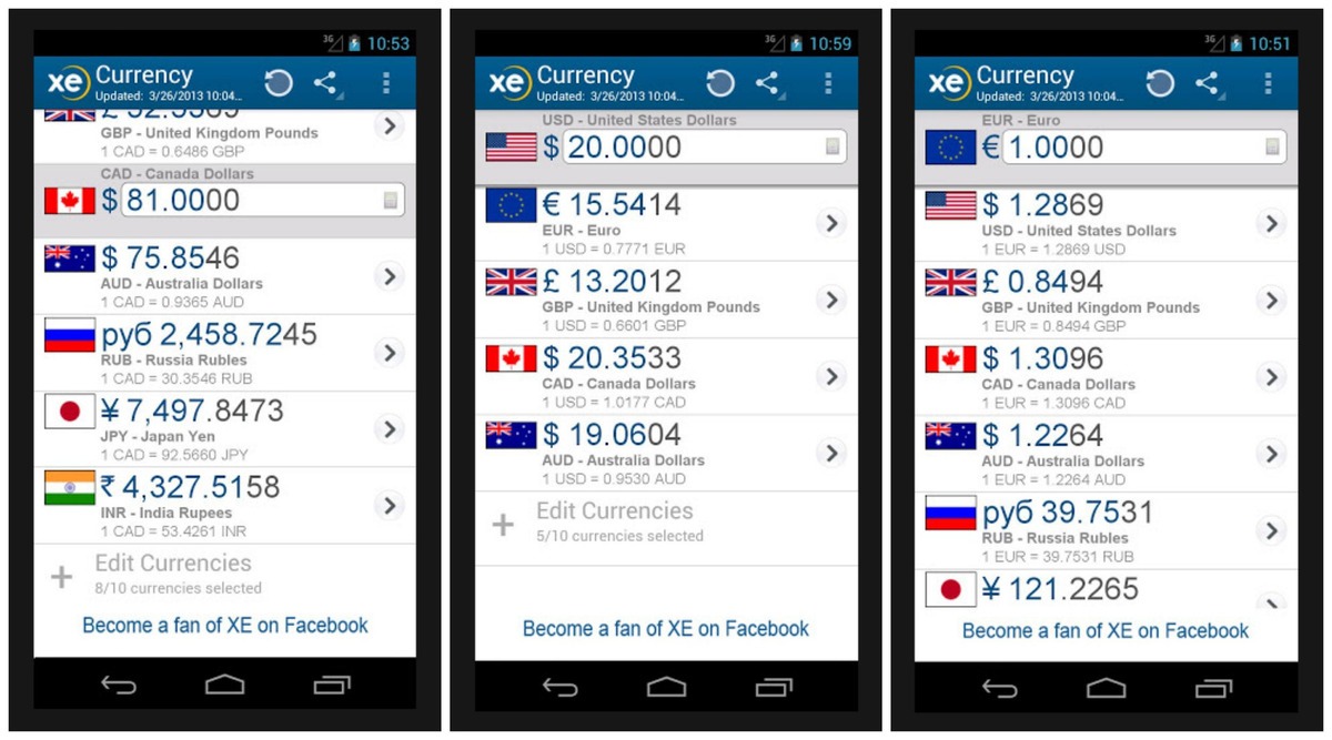 Phần mềm giúp mỗi lần đi mua sắm hoặc thanh toán khoản nào đó bạn sẽ không phải nhẩm nhẩm chuyển đổi ngoại tệ về tiền Việt. XE là một trong những phần mềm chuyển đổi tỉ giá đáng tin cậy nhất trên mạng. Bạn sẽ có kết quả chuyển đổi ra nhiều loại tiền tệ từ một đồng tiền ban đầu.
